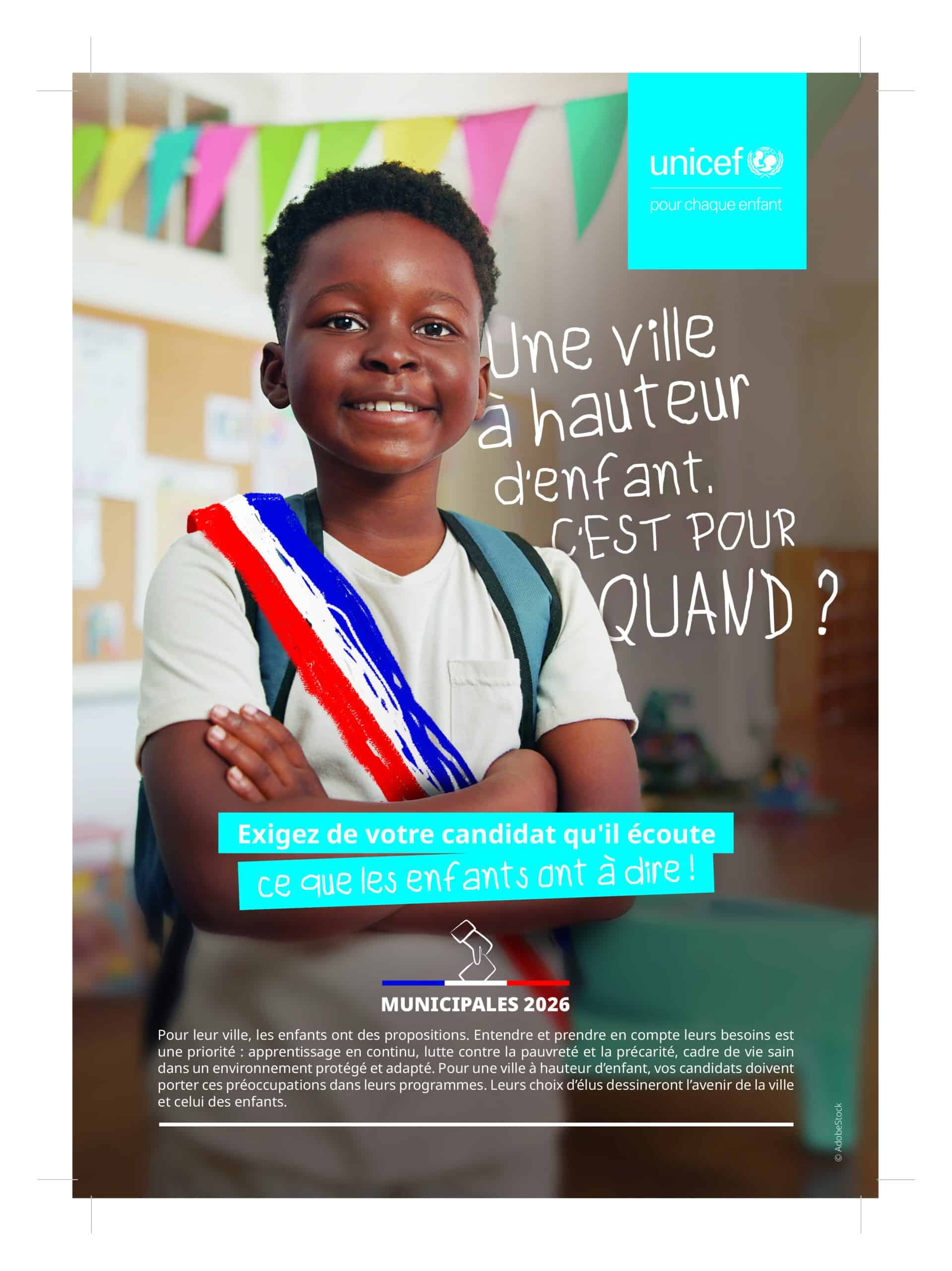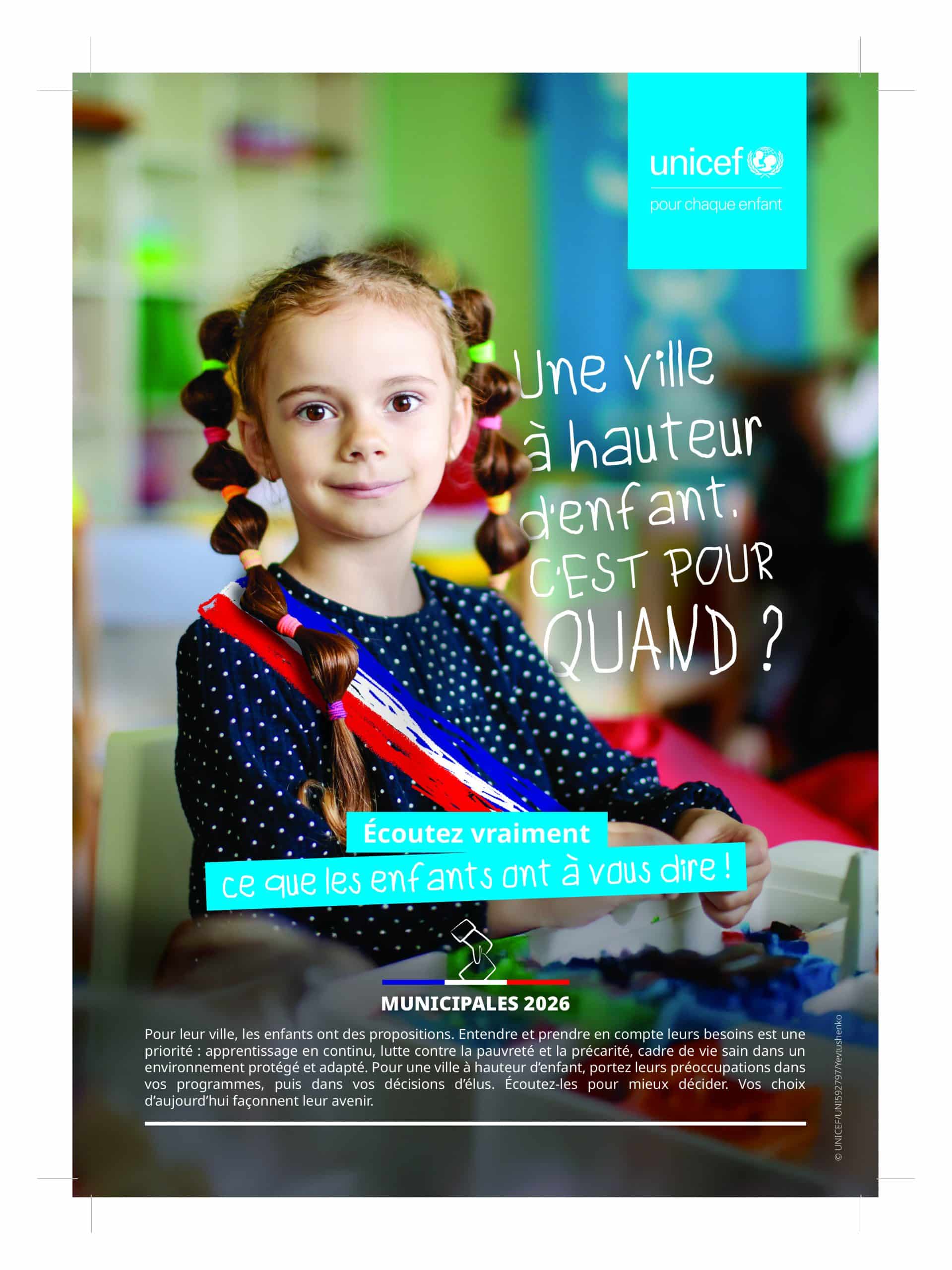Pour le prochain mandat municipal, l’UNICEF France invite les candidats à s’engager durablement en faveur des droits de l’enfant. Ces 10 engagements s’inscrivent pleinement dans la nouvelle dynamique territoriale lancée par l’UNICEF dès 2026, qui vise à renforcer l’action locale en faveur de l’enfance. Cette dynamique repose sur un double levier : le programme Ville amie des enfants, qui se densifie, et la création d’un nouveau réseau, Territoires d’enfance, pour accompagner encore plus largement les collectivités.